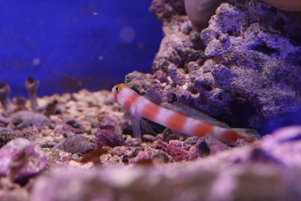 Apró fehéres testén narancssárgás- pinkes csíkok futnak, nagy szeme folyamatosan fürkészi az akváriumot és a külvilágot. Jellegzetes csipkézett hátúszóján fekete pötty látható.