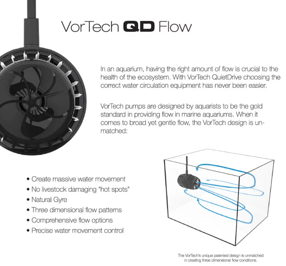 A VorTech szivattyúkat akvaristák tervezték, és a tengeri akváriumokban etalonnak számítanak. Egyedülálló kialakításuk révén széles, de gyengéd vízáramlást biztosítanak, anélkül hogy káros „hotspotokat” hoznának létre. Jellemzőik: